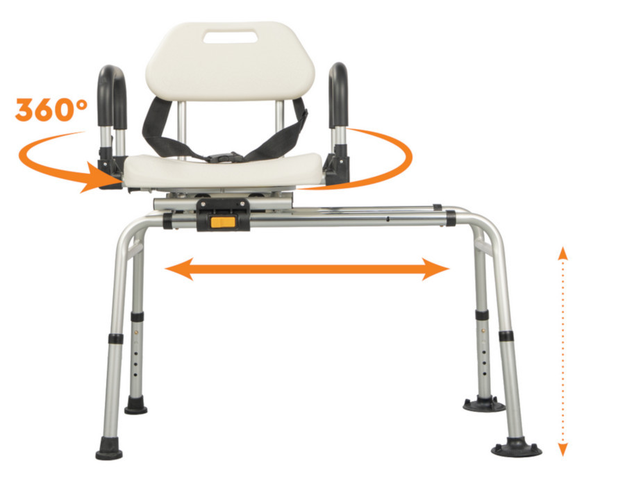 A csúszásmentes gumitalpak stabilan rögzítik a szerkezetet, így minimalizálva a csúszás és az esetleges sérülések kockázatát. Az állítható magasság lehetővé teszi, hogy a felhasználó saját igényeihez alakítsa a használatot, a háttámla és az öv pedig biztos támaszt nyújt. Az ülőfelület egy gomb segítségével előre-hátra csúsztatható, valamint egy karral 360°-ban elforgatható, így a be- és kiszállás folyamata lényegesen könnyebbé válik.