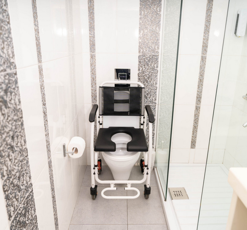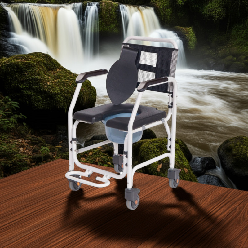Az Asper fürdőszobai gördíthatő fürdetőszék alumíniumból készült, színe fekete-fehér. Az Asper fürdőszobai fürdetőszék és szoba wc a személyi higiénia hasznos eszköze, akér szoba wc-ként akér zuhany székként is hazsnálható. Vízálló poliuretán (PU) üléssel, stabil karfákkal és lehajtható lábtámasszal rendelkezik. Kerekei fékezhetőek, ami biztonságot és stabilitást kínál. Alkalmas a páciens általi zuhany alatti használatra.