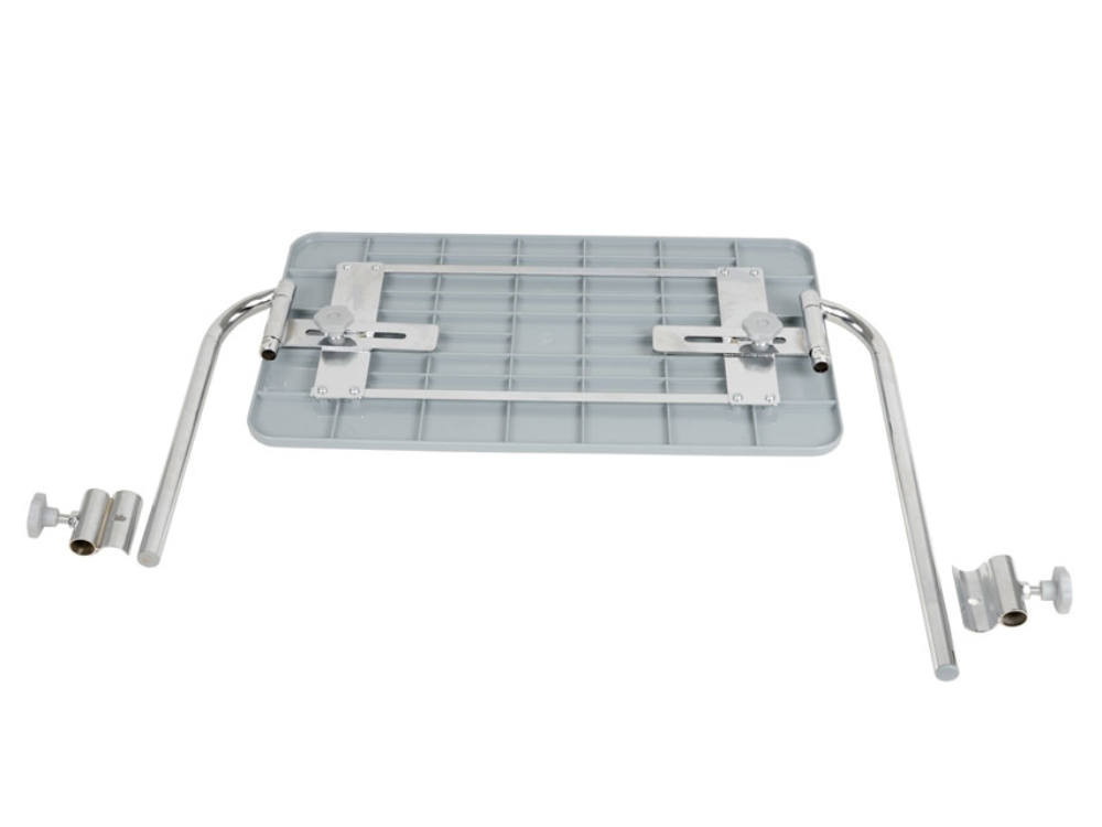 Felszerelése: A karfa alatti csavar meglazításával a karfa párna és a karfa fém közé helyezhető az asztal rögzítője. A csavar visszacsavarozzuk és a tálca egyszerűen felhelyezhető a helyére ahogy a mellékelt képek mutatják.