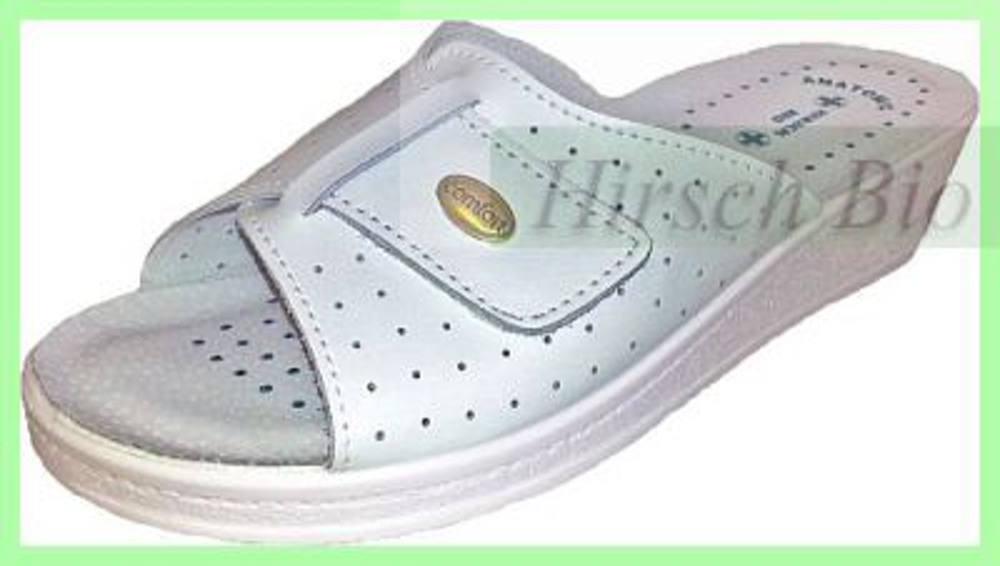 A fehér színű széles bőr felsőrész tépőzárral igazítható a láb formájához.