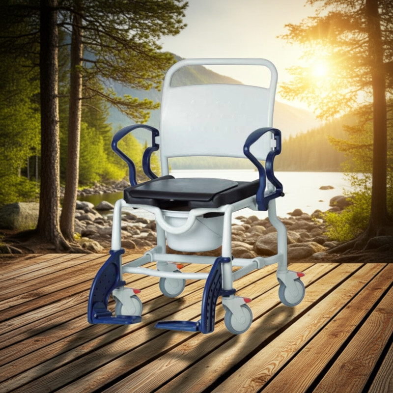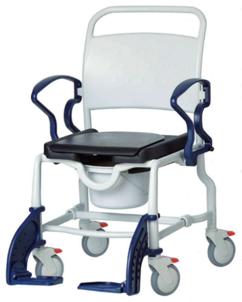A párnázott ülés higiéniai nyílással rendelkezik, amely elölre vagy hátrafelé is beállítható. A lábtartó elfordítható és lecsatolható, így biztosítva a könnyű be- és kiszállást. A négy darab, 5 colos bolygókerék irányzárral és rögzítőfékkel van felszerelve a biztonságos használat érdekében. A vödör és annak tartóeszköze a termék részét képezi.