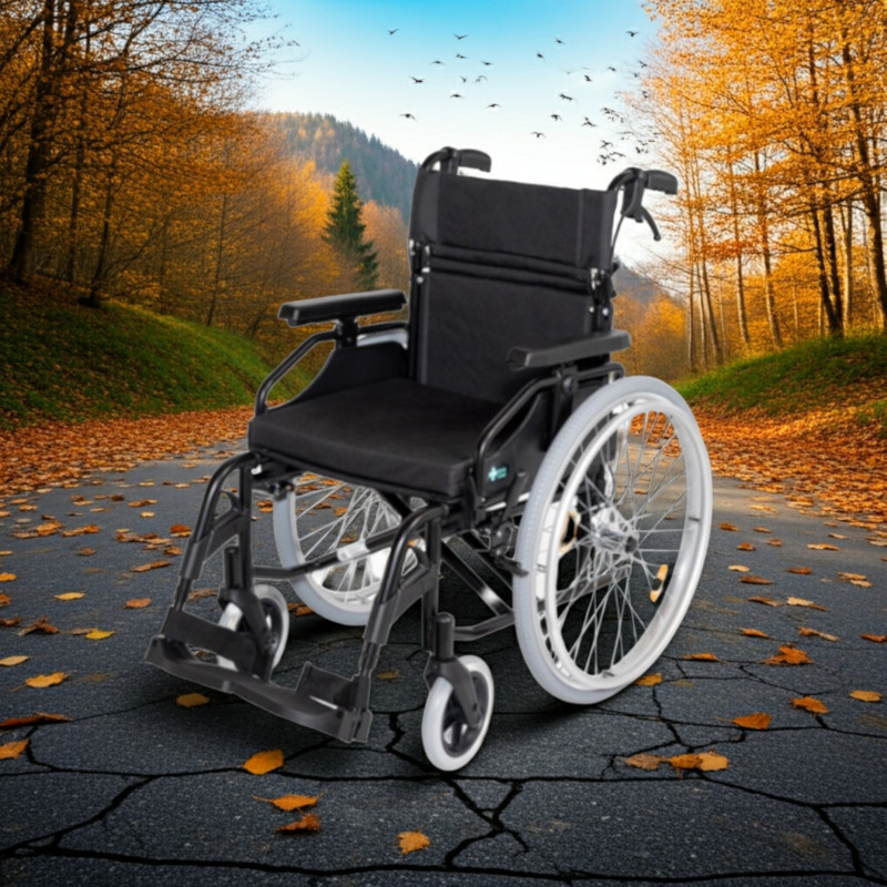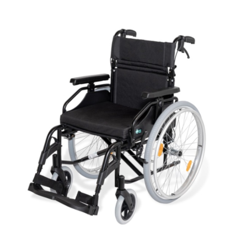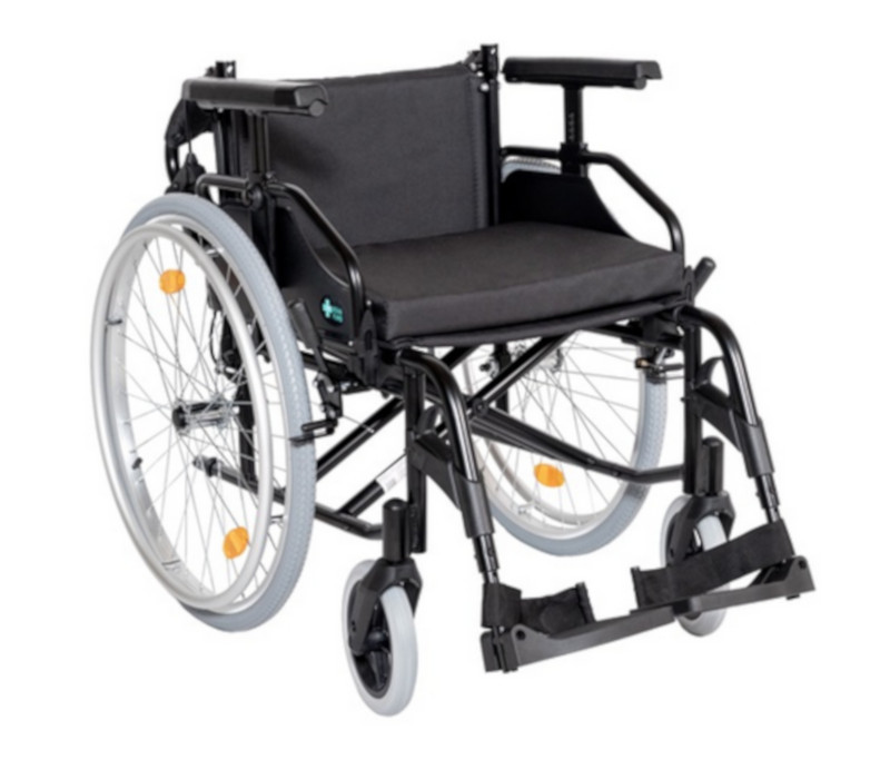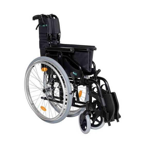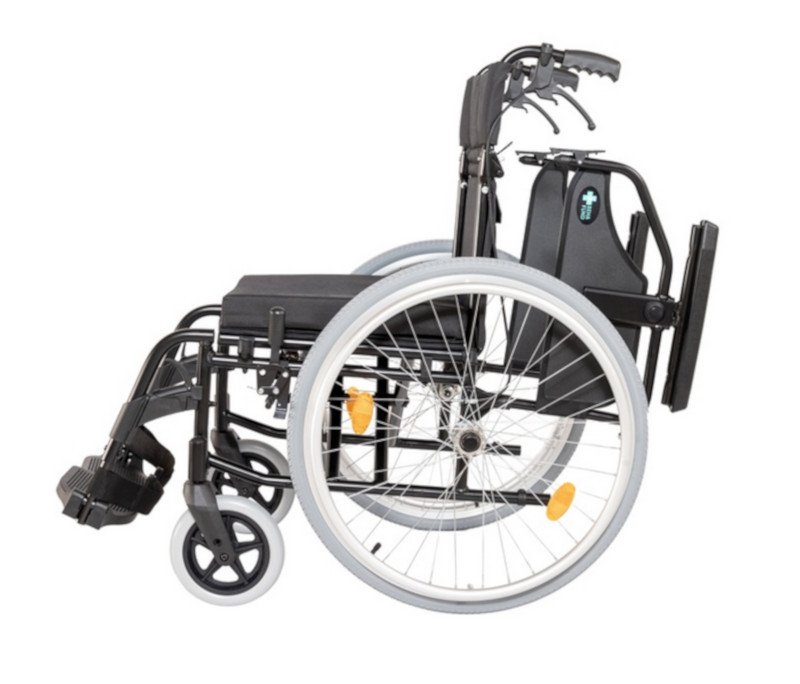 A dönthető és levehető lábtartók magassága állítható, megkönnyítve a be- és kiszállást. A gondozói fékek biztonságos irányítást biztosítanak.
