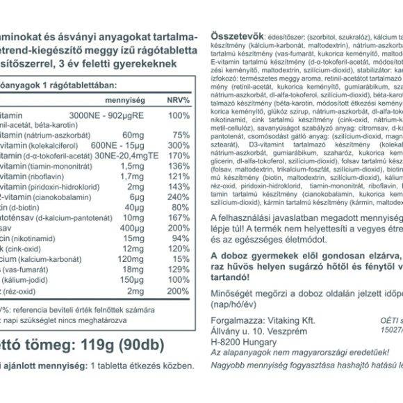 Gyerek meggyes multivitamin rágótabletta speciálisan a legkisebbeknek – 4-6 éves korosztálynak – készült. Meggy ízesítésű multivitamin készítmény, ami a gyerekek szervezetének igényei szerint lett kialakítva. Nagyon kellemes ízű, így könnyen megszeretik a kicsik, és fokozatosan hozzászoktathatóak az egészséges életmódhoz.